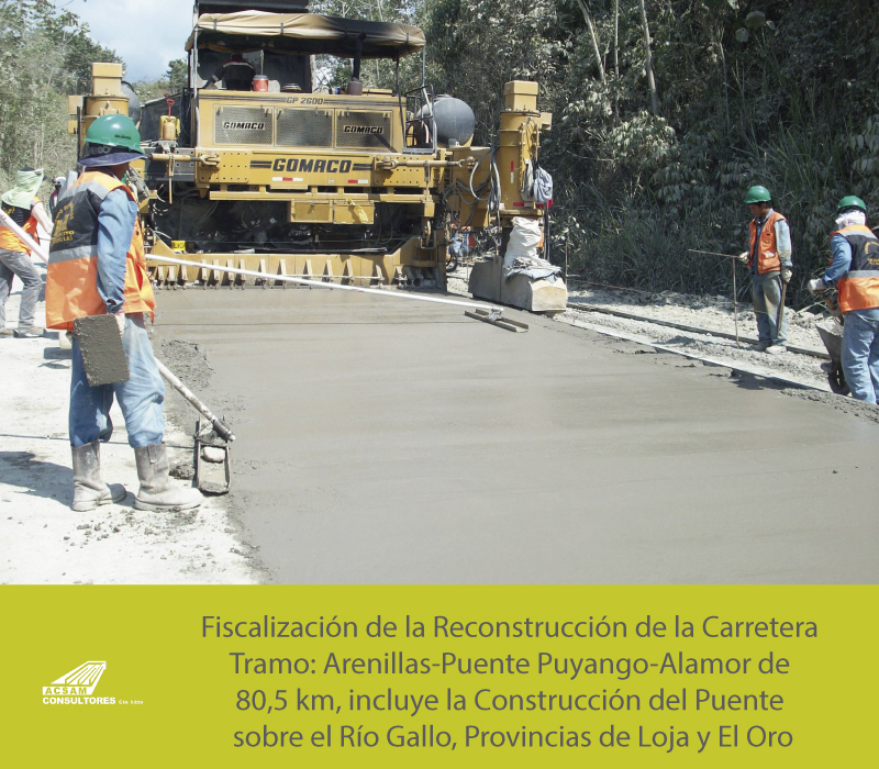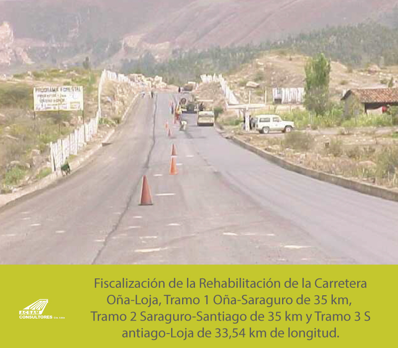 Fiscalización de la Rehabilitación de la Carretera Oña-Loja, Tramo 1 Oña-Saraguro de 35 km, Tramo 2 Saraguro-Santiago de 35 km y Tramo 3 Santiago-Loja de 33,54 km de longitud.
